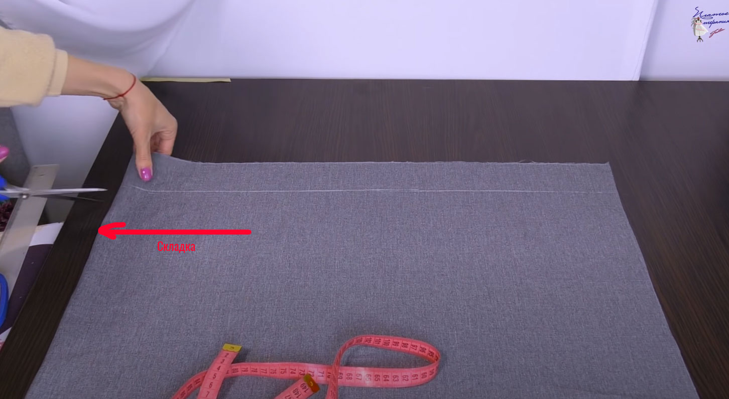 Итак, перед нами сложенный прямоугольник произвольной ткани, первым делом отрежем пояс. Для этого отмеряем 7см от верхней границы и смело отрезаем: