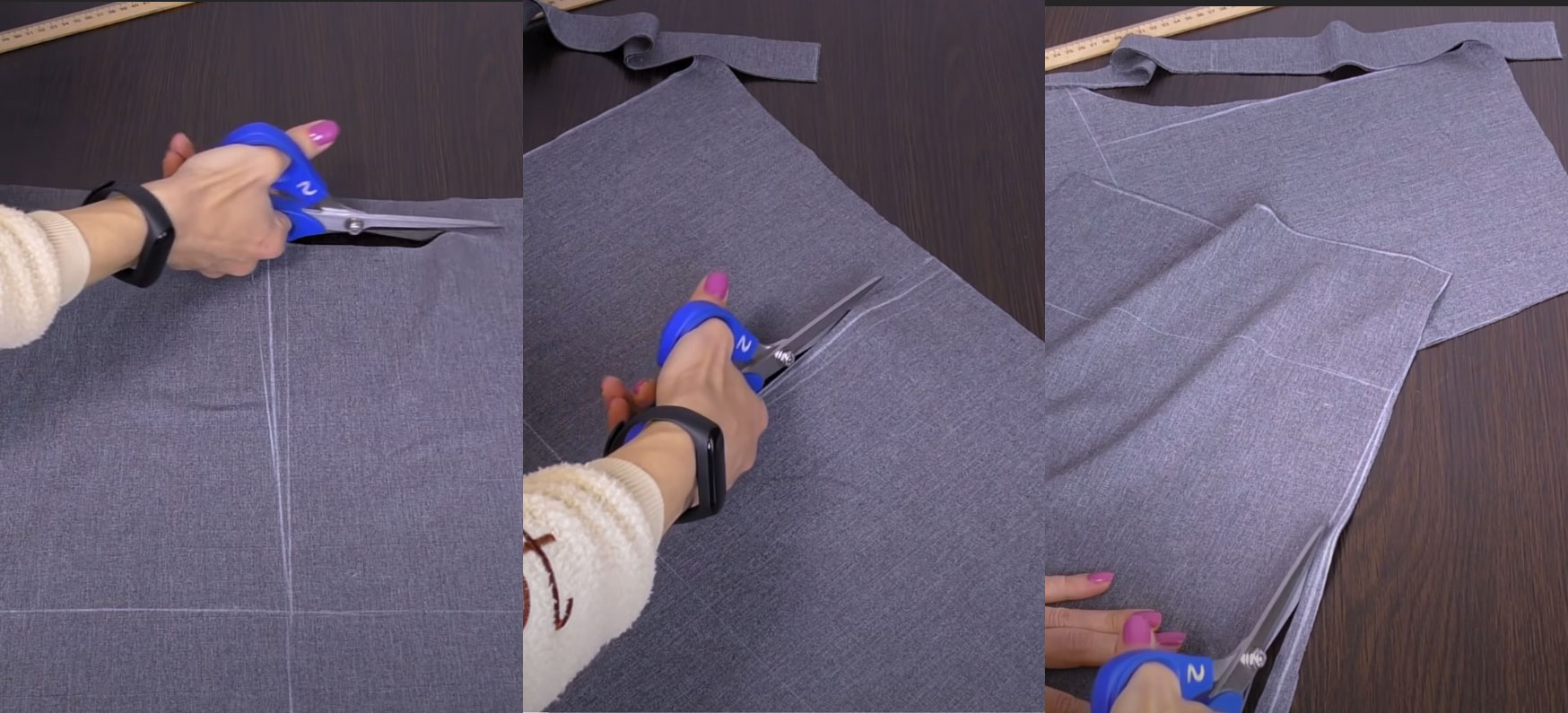 Соединяем мешковины кармана и передние половинки брюк лицевыми сторонами внутрь, прокладываем машинную строчку по разметке, уголки отрезаем, оставляя 1 см на припуск.