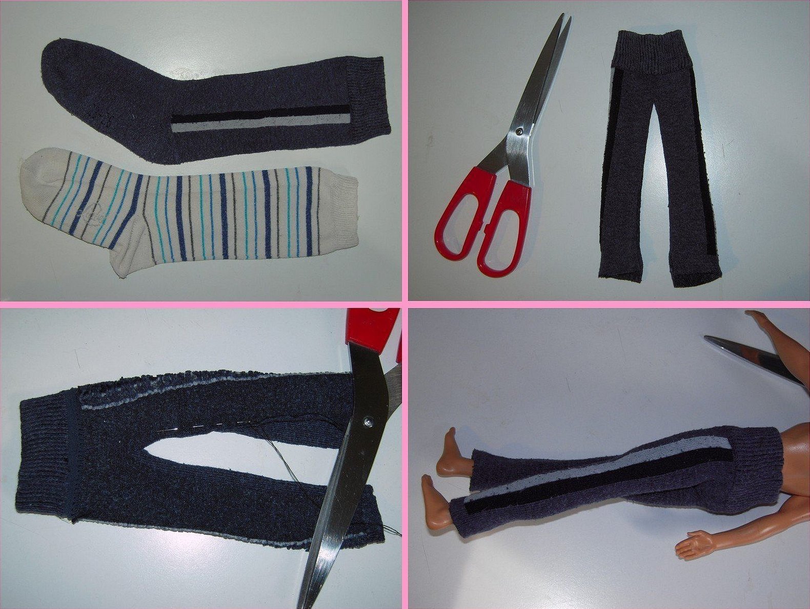 Для начала обрезается галошина носка под пяткой. Отрезанную часть нужно примерить на куклу, и определить длину разреза, что будет между ног. После детали сшиваются. Штанины лучше всего обработать, иногда их просто подворачивают для удобства.