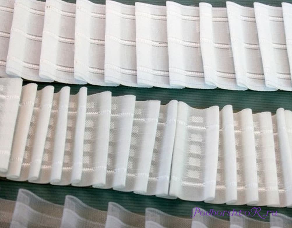 - Шторная лента (тесьма) приобретается в готовом виде и гарантирует равномерное распределение складок по всей ширине полотна. Для тяжелой ткани выбирается более широкая шторная лента.
