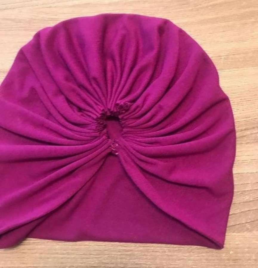 Еще тюрбан с бубликом из трикотажной ткани, сшитый на машинке, заметен машинный шов. Шился тюрбан для девочки, девочкам полагается все розовое, этот тюрбан тоже розовый, как многие другие, немного другой оттенок.