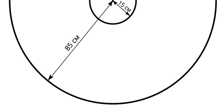 Из точки А начертите вторую полуокружность радиусом R2=R1+ 70 см (длина изделия)= 22,9+ 70=92,9 см.