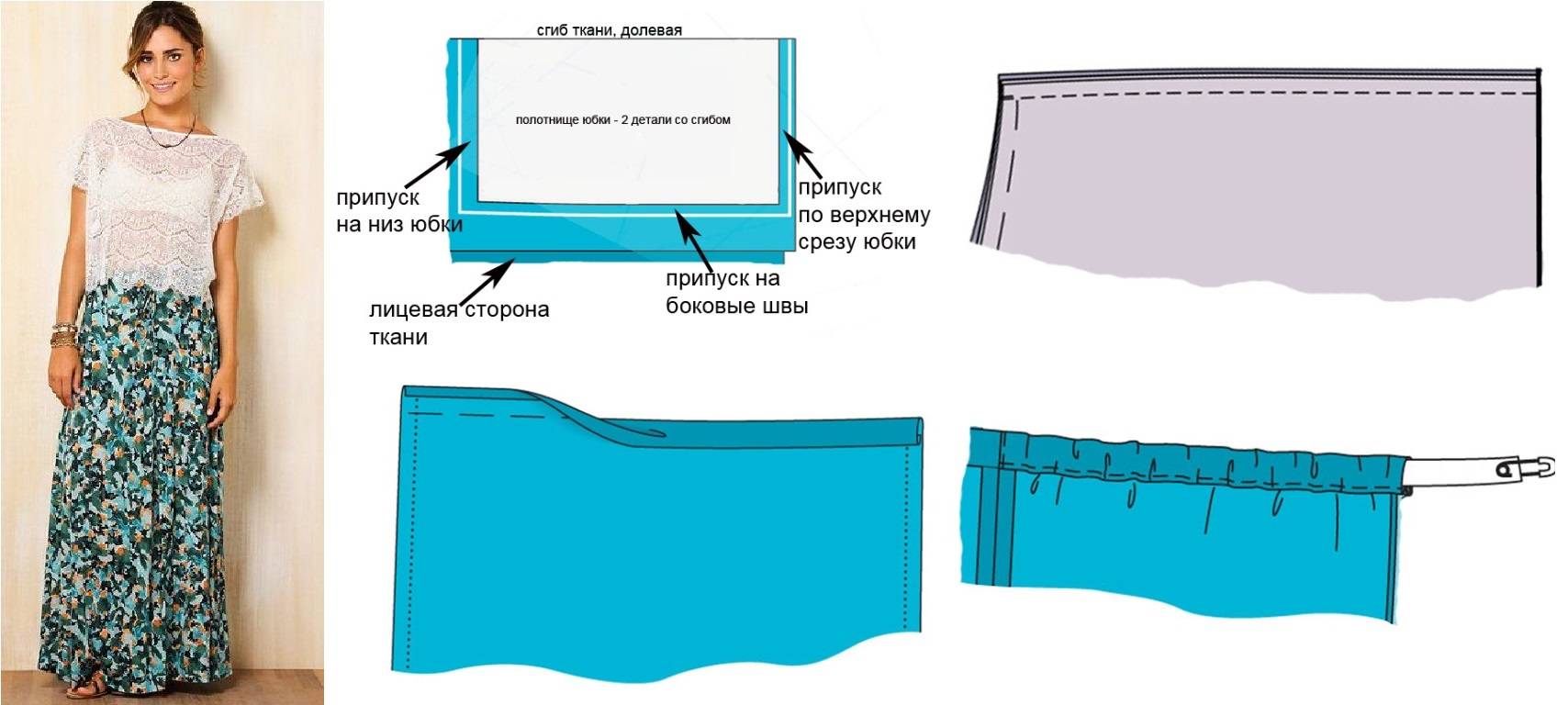 - Очень легко сшить длинную юбку на резинке. Это идеальный вариант, если нужно скрыть несовершенства ног. Ткань раскраивается двумя прямоугольниками. Ширина — это обхват бедер, умноженный на 1,3–2 (зависит от пышности готового изделия). К нужной длине прибавляется 5–6 см на швы. После сшивания деталей и обработки швов останется только вставить сверху резинку.