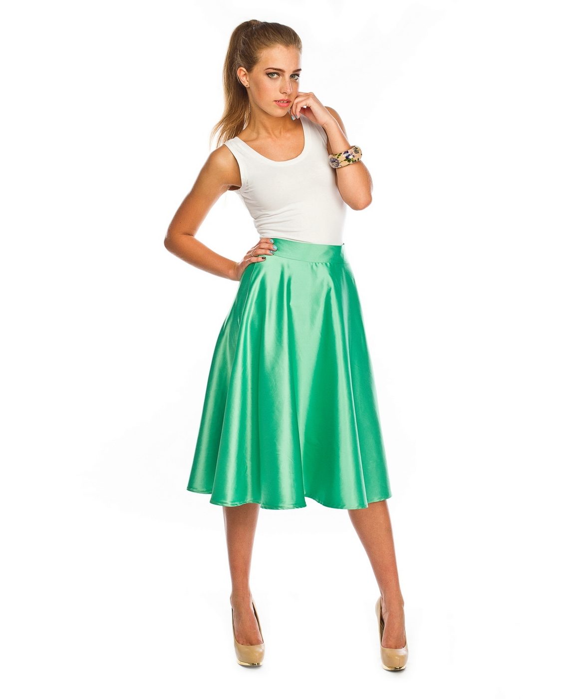 Длина миди предполагает, что край юбки приходится на 5-15 сантиметров ниже колена. Такая длина очень характерна для юбки-полусолнца.