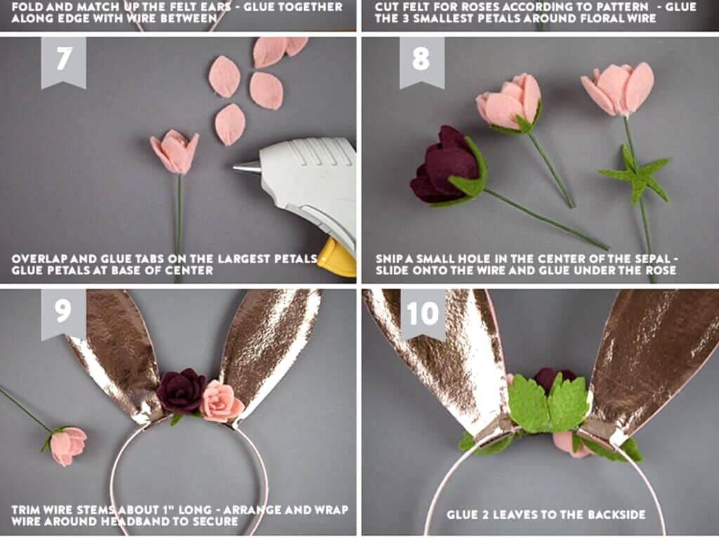 Далее, делаем 3 розы и листики из фетра и проволоки. Каждая роза имеет 12 небольших лепестков и зелёное основание в виде звездочки (фото 8). Как сделать так, чтобы роза держалась на проволоке? Это просто: нужно взять бусину или маленькую пуговицу и продеть конец проволоки в бусину или пуговицу. Закрутить конец проволоки у основания бусины. Делаем розу, используя клеевой пистолет или клей. Закручиваем стебель роз вокруг ободка, приклеивая или пришивая несколько листиков из фетра. Ушки готовы.