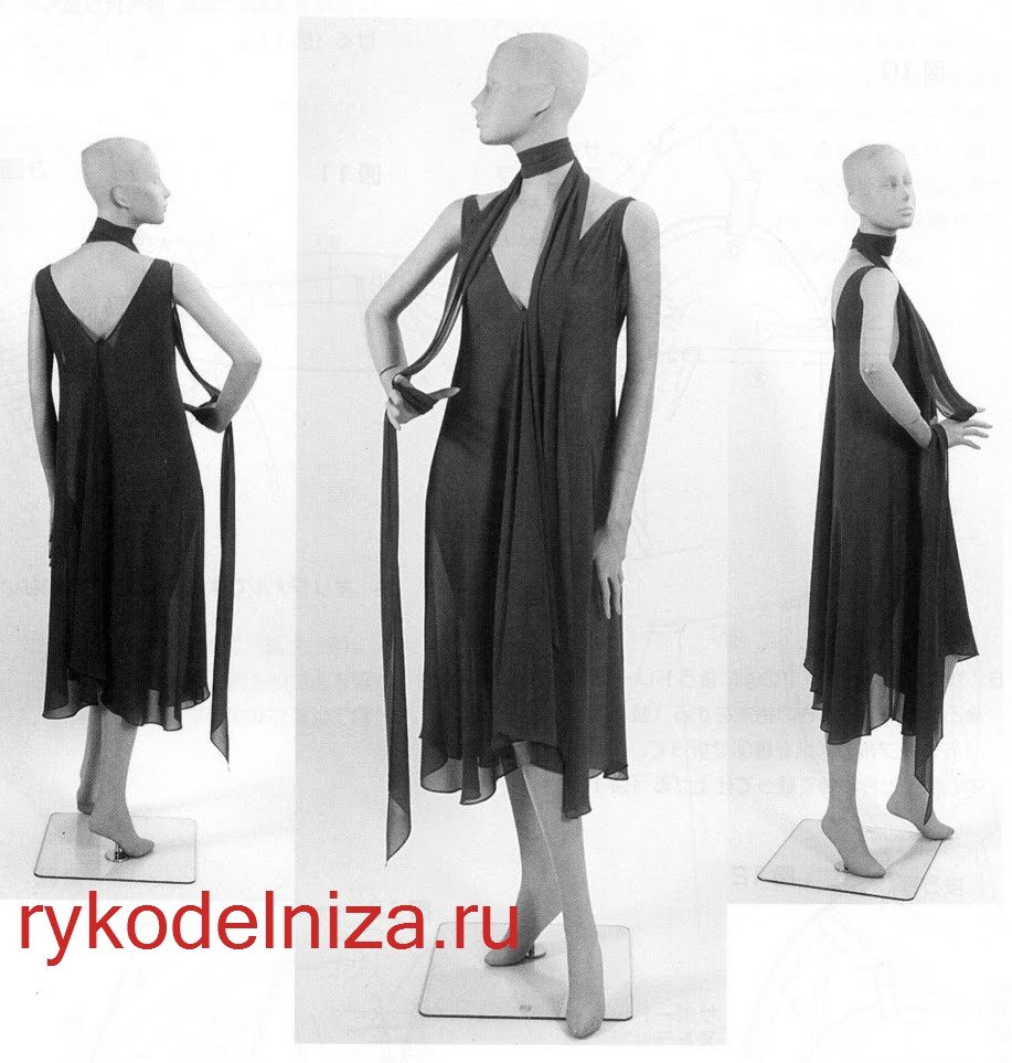 Нам понадобится большой кусок ткани. Его размер зависит от длины будущего платья и объема бедер. Для такой модели лучше выбирать легкие и пластичные ткани. Шов сделать очень просто. Надрезы необходимо обработать, сделать и пришить лямки. Осталось обернуть ткань вокруг тела (см. Фото) и продеть руки через лямки. Самое простое бесшовное платье готово! Можно добавить пояс.