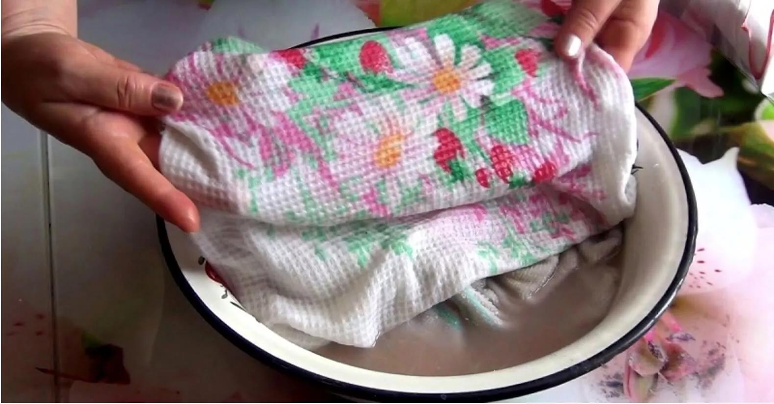 - В раствор кладут грязные полотенца, оставляют на 6–8 часов, а лучше на ночь.