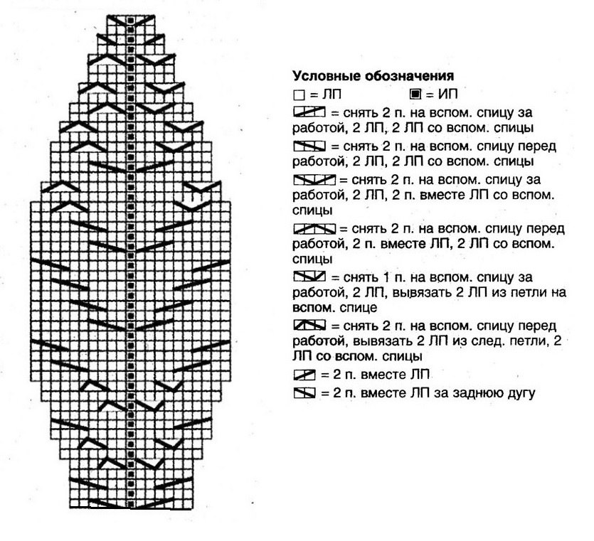 След. р.: *3и., рельеф – см. схема (накиды пред. р. провязывать лиц. п. за нижние дольки)* – повторить от * и до * на всех п. рядка (это 7(8) раппортов). Когда число петелек в работе уменьшится, переходим на чулочные сп. Вывязав раппорт в высоту – 42(48)п., в след. р. делаем убавки. Схема такая: каждые 3изн. п. резинки вывязываем в 1изн. У нас остается 28(32)п. В след. р. каждые 2лиц. п. провязываем в 1лиц. п. У нас остается 14(16)п. Обрываем нить, крючком продеваем ее через оставшиеся петельки, стягиваем, выводим на изнаночную сторону и закрепляем.