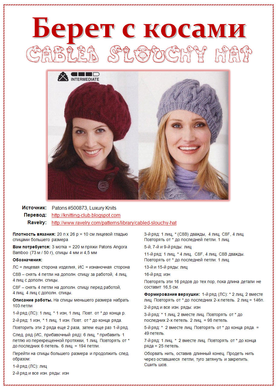 Если вы хотите связать розовый берет с узором косы, то вяжите по описанной схеме до достижения длины бейки 56 см (это окружность головы). Закройте 11 петель и у вас получится бейка, связанная узором «жгут».
