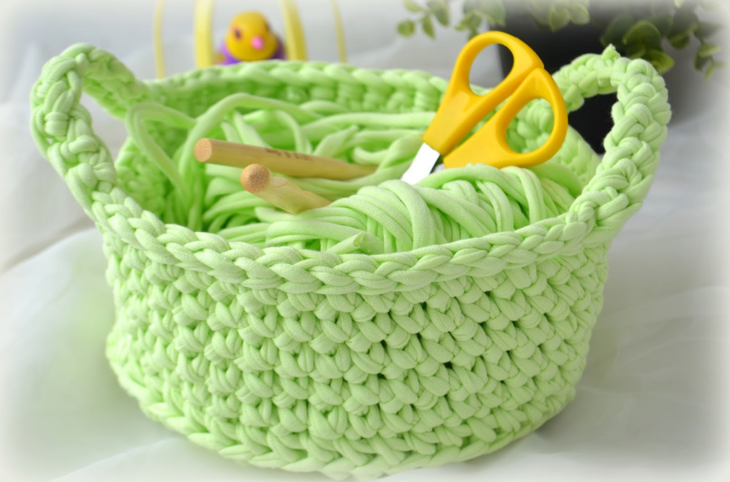 Корзинка из трикотажной пряжи — вещь в доме особо полезная. Она может быть большая для грязного белья или детских игрушек, а может быть маленькая с крышечкой для бижутерии или мелочей. Удобно использовать корзинку для мелкого рукоделия, чтобы все необходимое было под рукой.