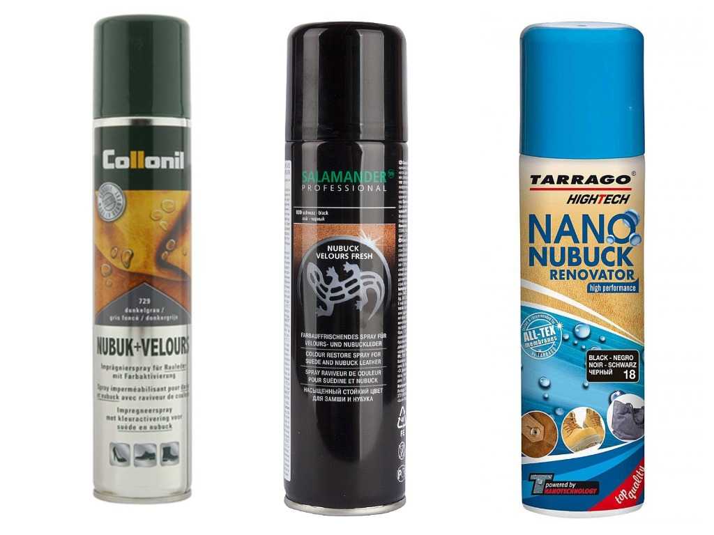 Краска: выпускается в аэрозоли или жидком виде. Средство, подобранное в тон обуви, отлично маскирует мелкие дефекты, возникающие при носке, освежает и делает цвет равномерным. Помимо покраски, защищает нубук от пыли, грязи, осадков.