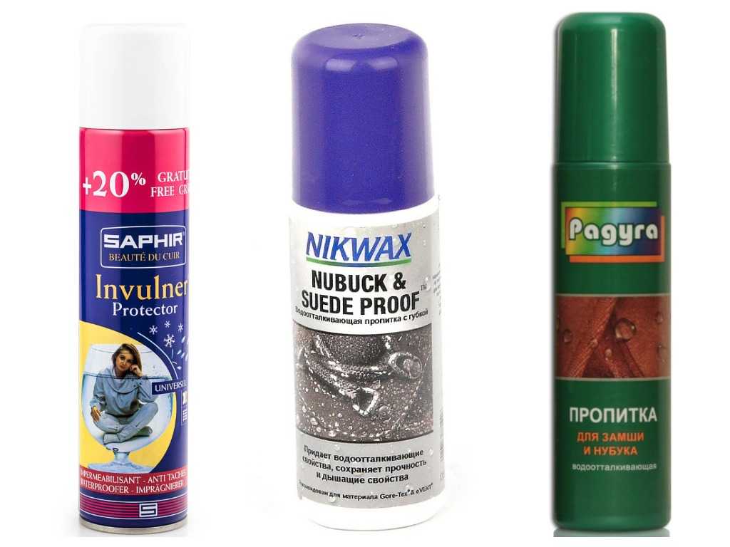 Пропитки: бывают разных видов: только от грязи, влаги или комбинированного действия. Применяются для защиты нубука от промокания, пятен, соли, реагентов. Средства наносятся за 10-12 часов до выхода, чтобы вещества максимально пропитали материал и образовали защитную пленку.