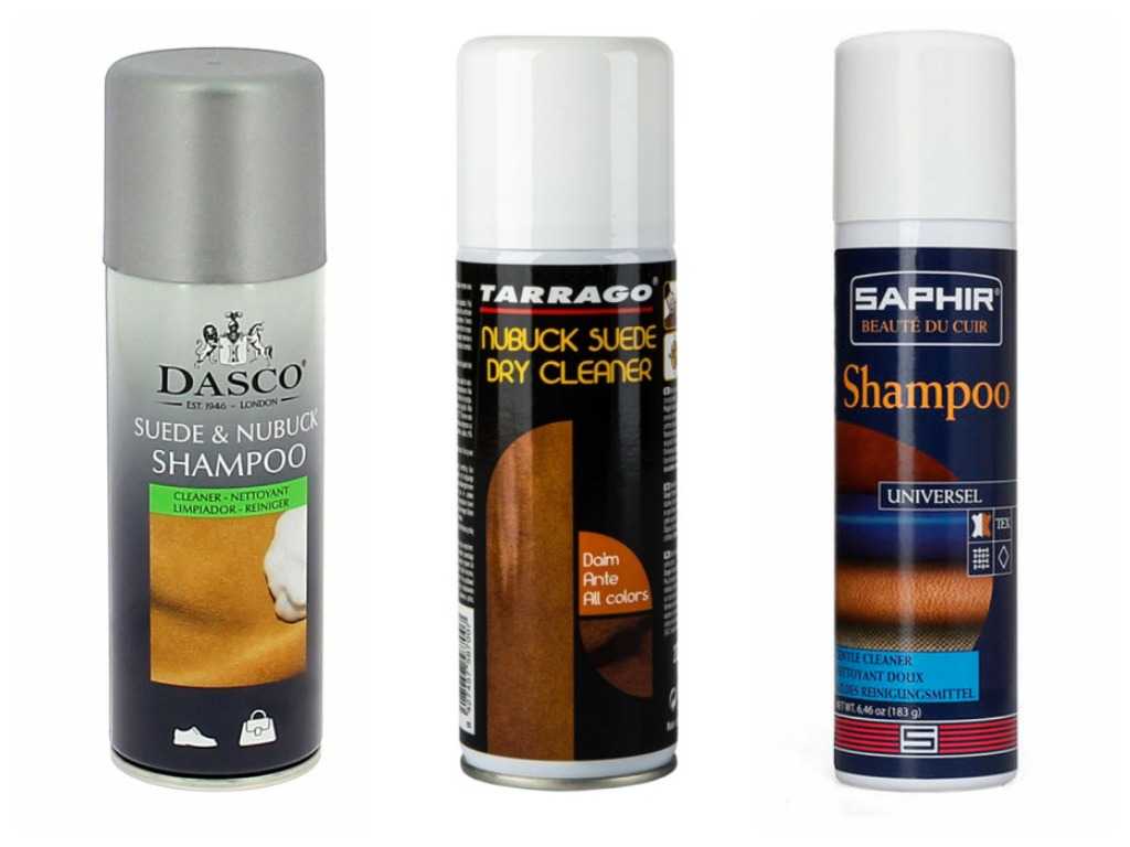 Применяются для избавления от сильных загрязнений. Предварительно туфли очищаются, а затем на них наносится средство, которое втирается поролоновой губкой. Перед началом всех манипуляций необходимо проверить реакцию материала на чистящий шампунь на незаметном участке обуви.