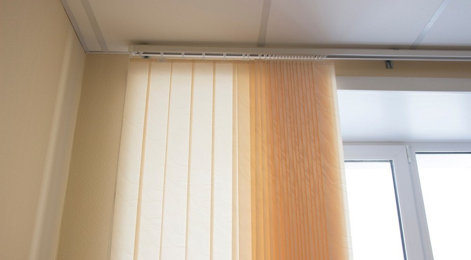Вертикальные жалюзи изготавливают из ткани, пластика, дерева и алюминия. Ламели закреплены внутри карниза и соединены внизу цепочкой. Стандартным решением является размещение изделия над оконным проемом или на потолок, в таком случае проблем с шириной штор не возникает, они будут выступать на 15-30 см.