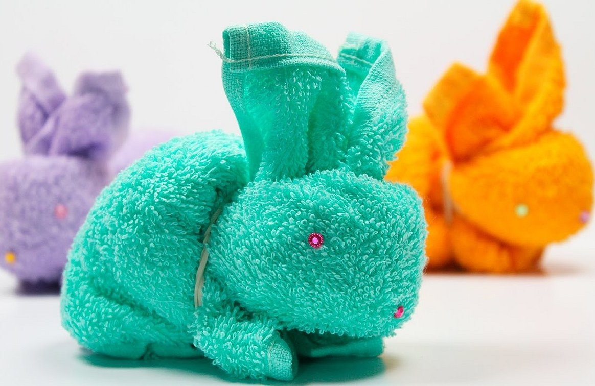 Потом “рулет” складывают пополам, причем два раза. Концы полотенца изображают длинные ушки косого, а согнутую пополам ткань укладывают на поверхность стола. Затем лентой или резинкой передний конец (сгиб полотенца) стягивается таким образом, чтобы получилась маленькая мордочка зверя. Можно на булавки прикрепить носик-помпон и маленькие глазки. На резинку сверху завяжите красивый бант из яркой атласной ленты контрастного цвета.