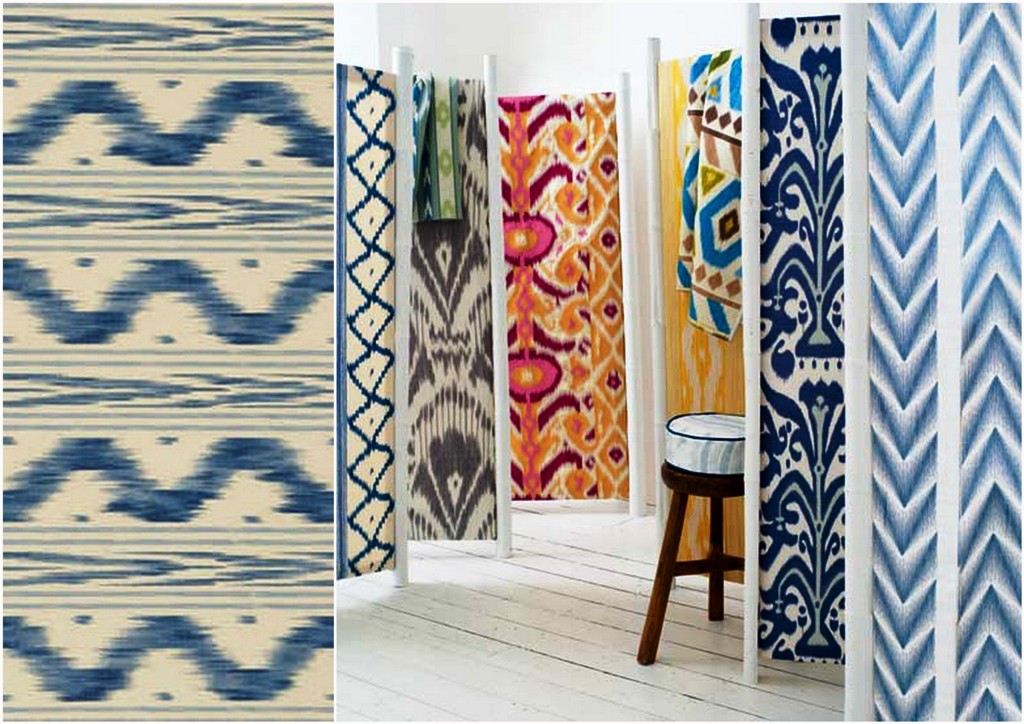 Изначально это была особая технология производства ткани на ручных станках, которая окрашивалась особым образом. Такой себе хенд мейд, история существования которого насчитывает не одну тысячу лет (существуют документальные подтверждения существования таких тканей в Индии ещё в 5-6 веках до н.э.). Узоры иката имеют ступенчатые, но несколько размытые контуры, часто ими орнаментируются мифологические сюжеты или сцены из жизни. В японских вариациях применяются медальоны и оригинальные геометрические вставки, часто на полосатом фоне. Сложность производства делала икат дорогостоящим материалом, поэтому ткани были доступны только состоятельным людям. Сегодня межклассовые рамки стерты, но такой принт отлично подчеркнет обеспеченность хозяев (при условии соответствующей обстановки и обрамления). Традиционная цветовая гамма оформления — красный, желтый, синий. Выгодно смотрится на постельном белье и коврах ручной работы.