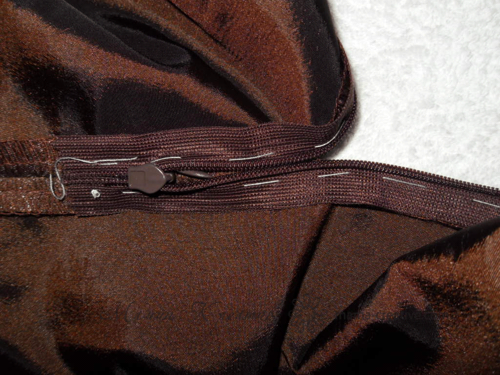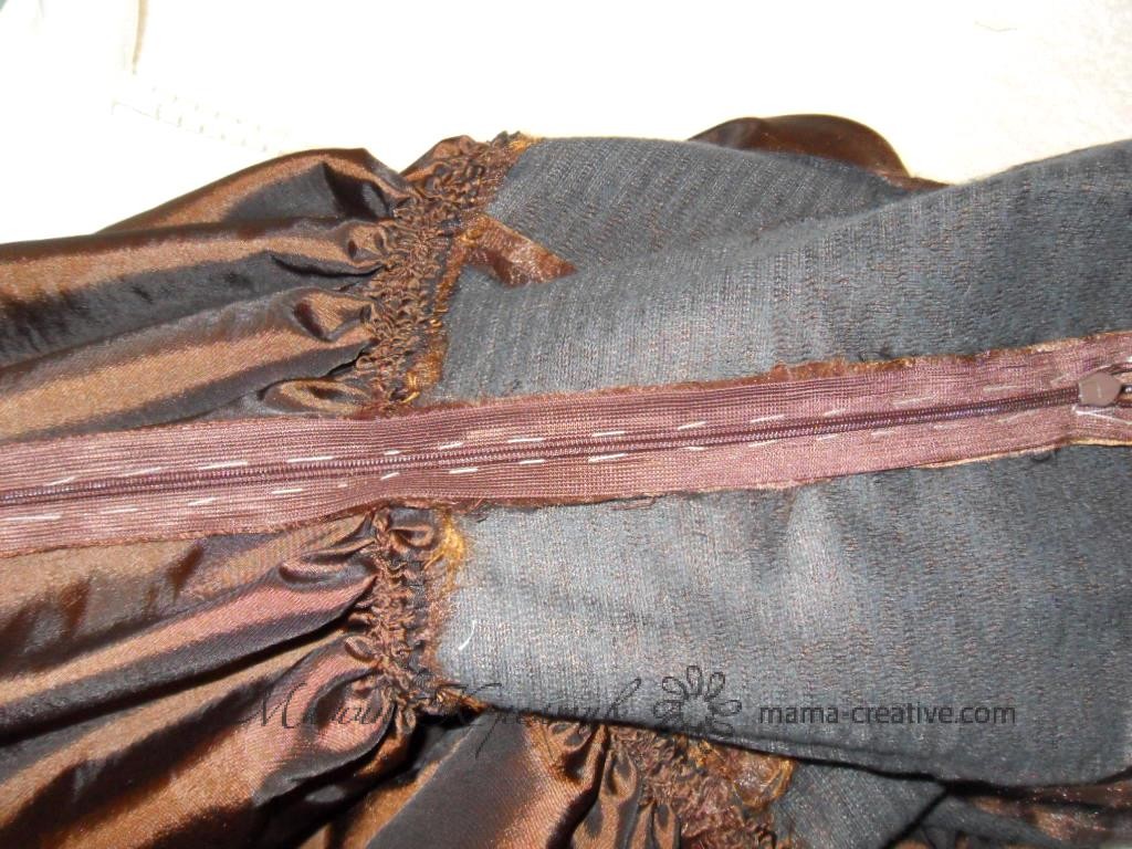 5. После того, как молния вметана, выдергиваем нить сметывания среза (!) и на основном платье, и на подкладе.