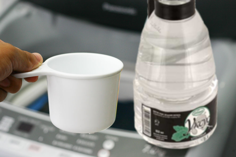 2. Добавьте 2 чашки уксуса в процессе полоскания. Сначала разведите уксус или подождите пока все тщательно перемешается, только после этого киньте туда полотенце, в противном случае, это может привести к потере цвета. Второй цикл стирки можно добавить 1/2 чашки соды, но не используйте соду и уксус одновременно! Если ваша машина имеет дозатор жидкого смягчителя ткани, налейте уксус в него.