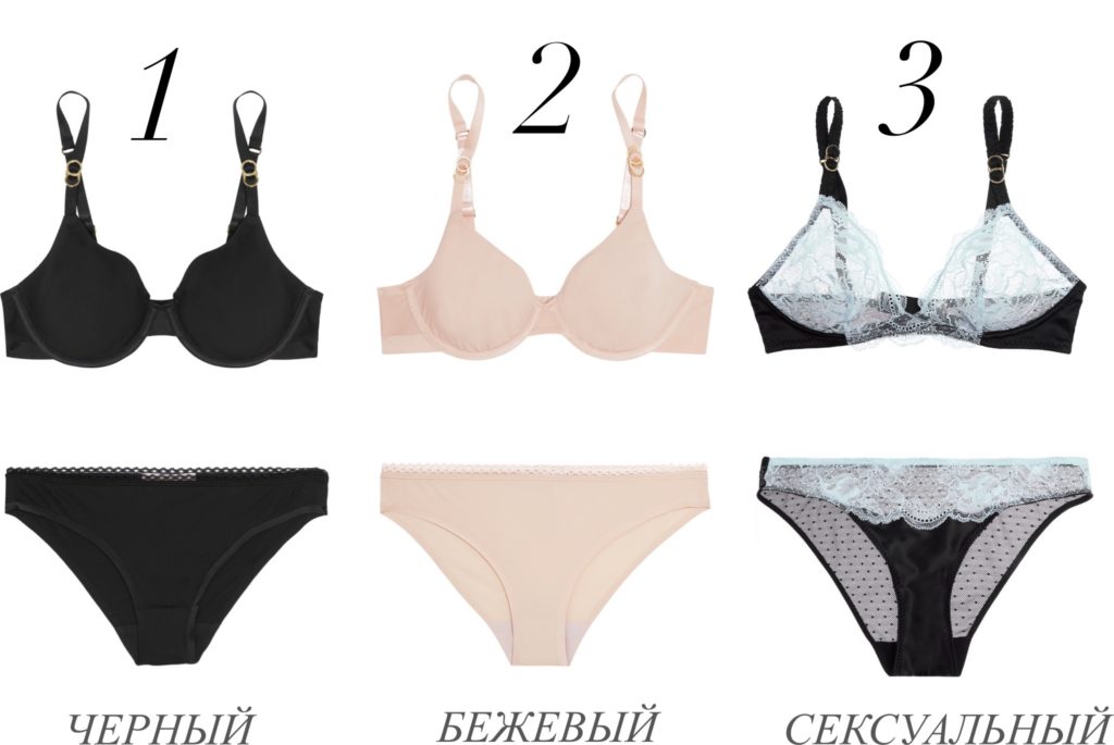 Третье правило при выборе нижнего белья — это подбирать комплекты, которые будут гармонично сочетаться между собой и с вашей одеждой. Комплект нижнего белья может состоять из двух или трех предметов: бюстгальтера и трусиков, или бюстгальтера, трусиков и пояса для чулок. При подборе комплекта нужно учитывать несколько факторов: