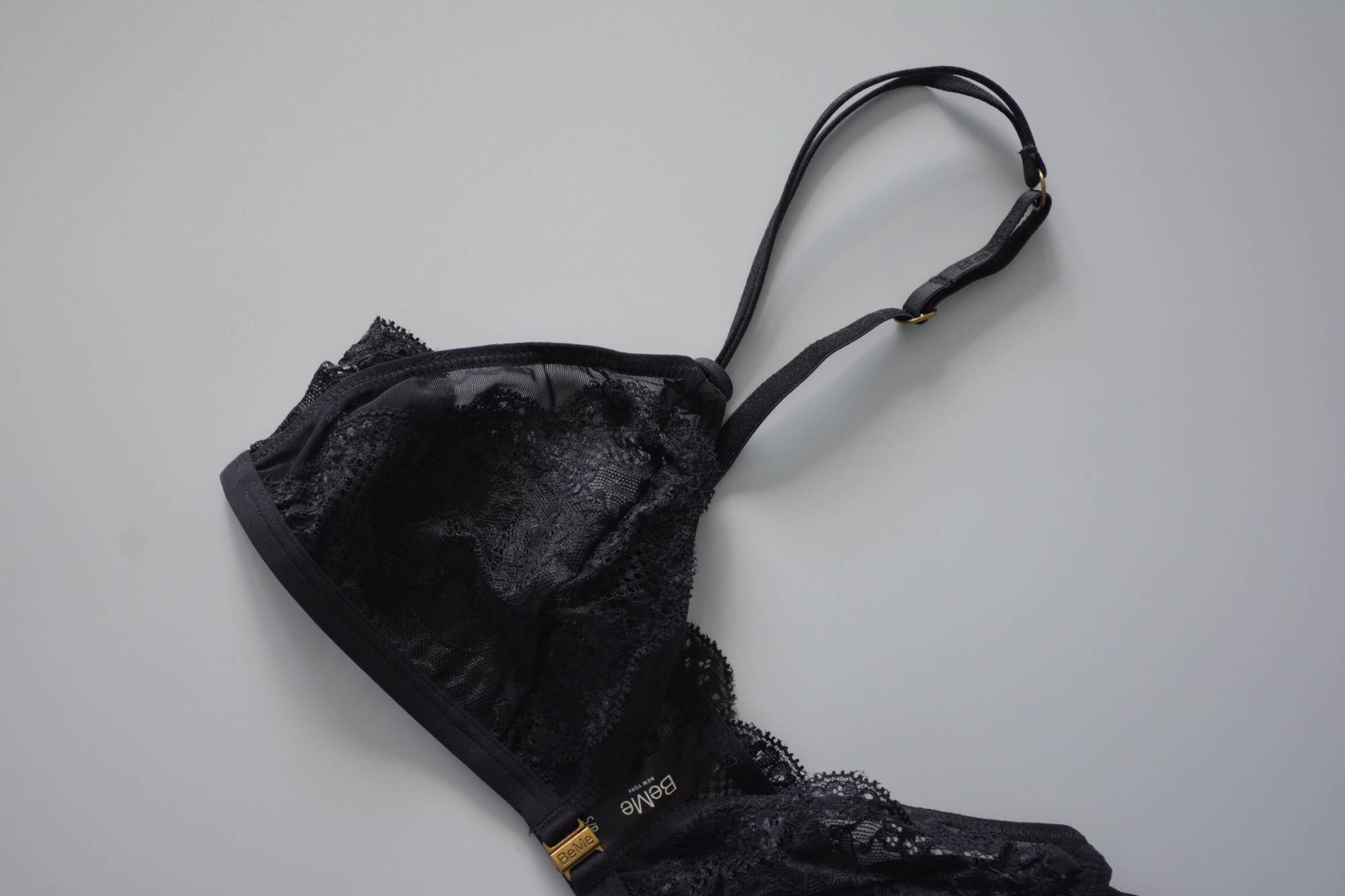 Бралетт выглядит как два треугольных кусочка ткани, которые закрепляются под грудью горизонтальной повязкой.