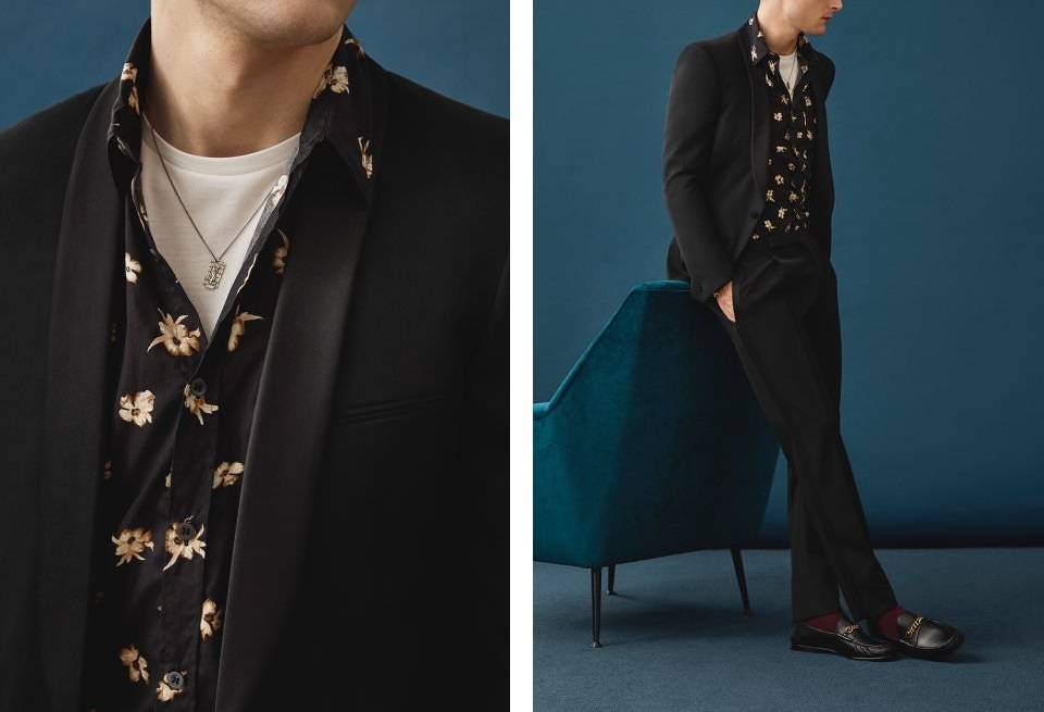 Ты можешь иногда слышать термины «Голливудский черный галстук» или «креативный черный галстук», которые по сути являются разрешением на эксперимент – иногда слишком большое разрешение на слишком много экспериментов. Но, какой бы свободной ни была твоя интерпретация черного галстука, помни золотое правило: приложи усилия. Здесь мы видим черный смокинг с атласной отделкой от Saint Laurent, учитывая отчетливо мятежный поворот с расстегнутой рубашкой с принтом, надетой подвеской и лоферами Tom Ford.