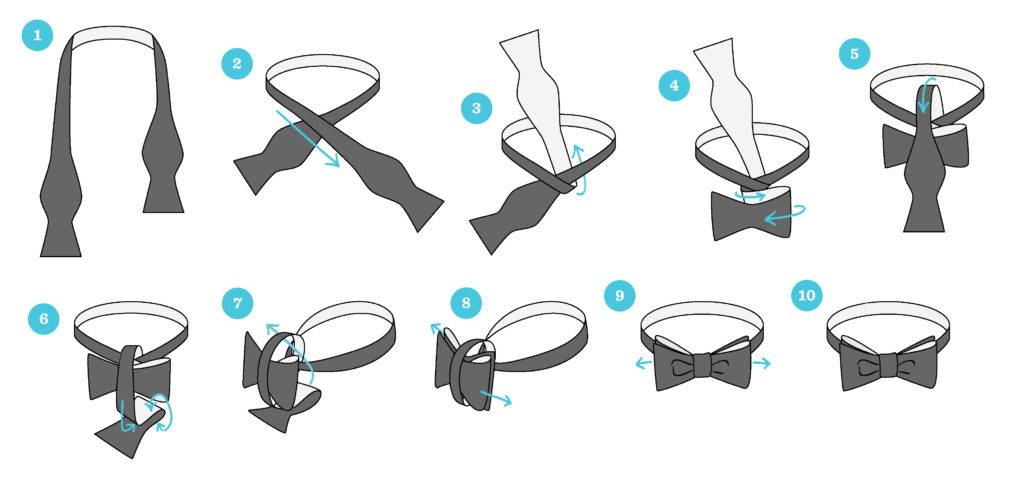 Далее приводится пошаговая инструкция, ознакомившись с которой каждый желающий сможет усвоить, как завязывать галстук бабочку при необходимости. Она включает в себя следующие операции: