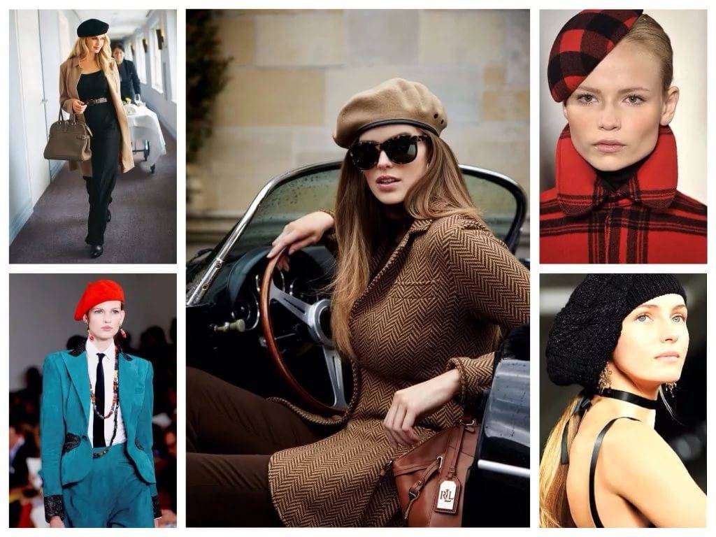 Бренд Gucci является поклонником винтажной моды. Стильные кашемировые головные уборы удачно сочетаются с лёгкими платьями, ретропальто, натуральным мейкапом. Бренд Luisa Beccaria всегда предоставляет береты, которые скашивают на один бок. Здесь используются дорогие ткани, подчёркивающие роскошные образы.