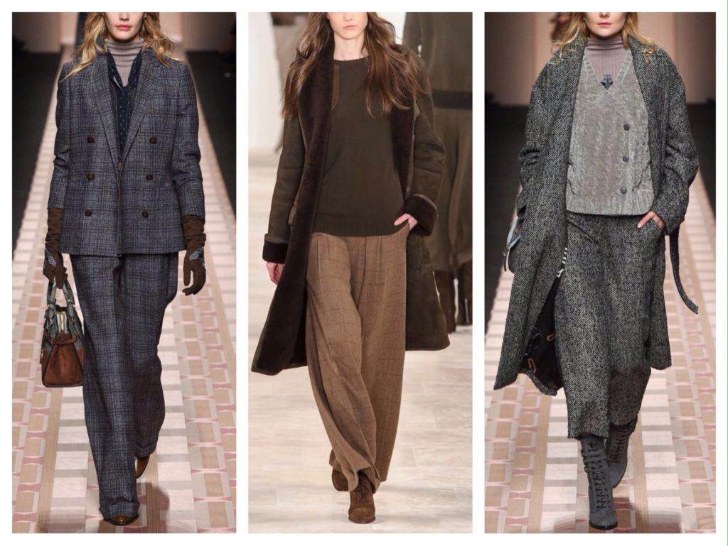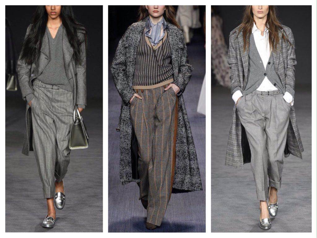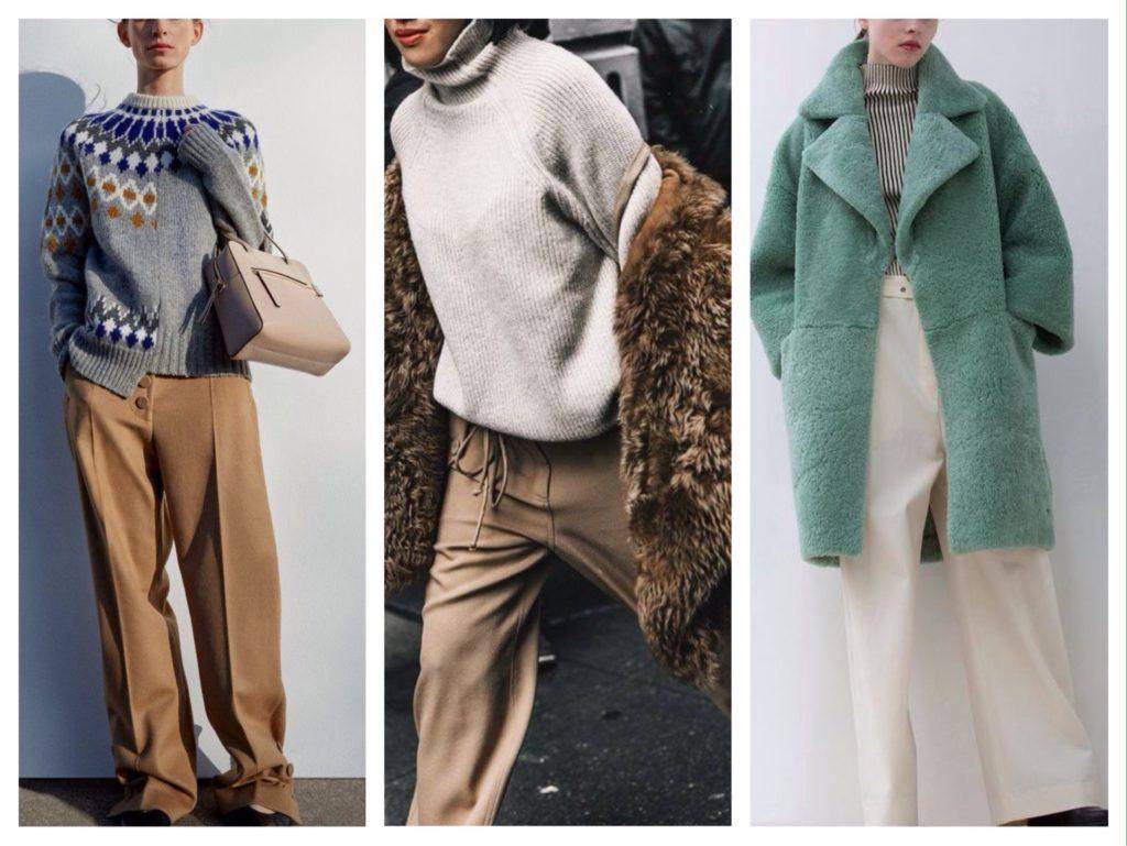 Шерстяные брюки разных фасонов считаются базовыми на зиму – классического кроя, укороченные, широкие, узкие, на резинке, с высокой или низкой посадкой, со стрелкой и без, с подворотами, в виде кюлот. Как видите, есть много вариантов, какую одежду можно приобрести, когда на улице холодно. Какие цвета доминируют? Брюки из шерсти, в основном, однотонные – серые, черные, оливковые, бежевые, карамельные, песочные, молочные. Принты маловыразительны – актуальная клетка, полоска.