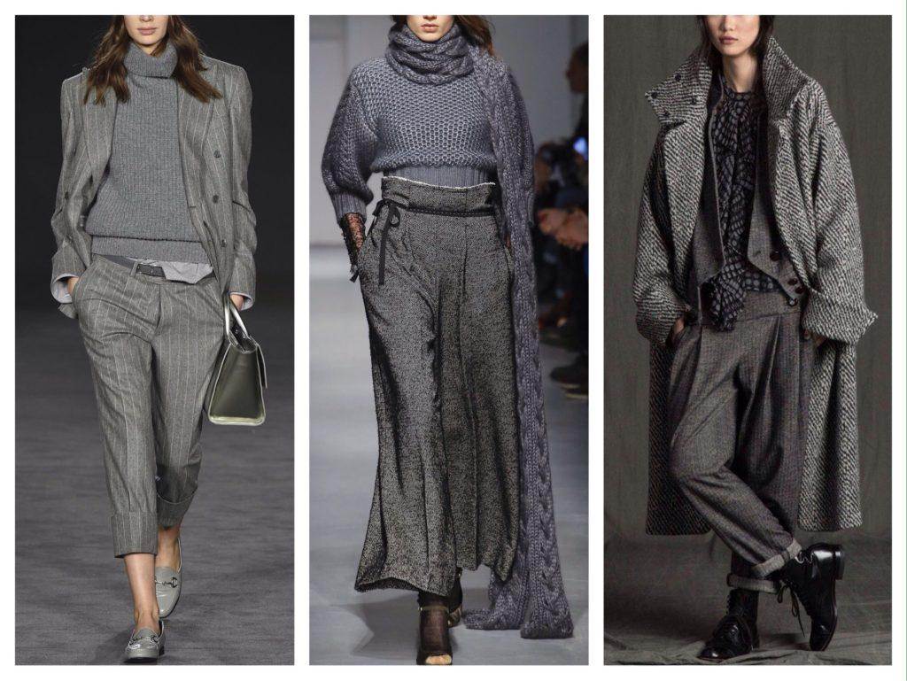 Серые, зауженные брюки отлично смотрятся с классическими пальто, полупальто, натуральными и искусственными шубками. Такой образ рекомендовано дополнить обувью на каблуке и правильно подобранными аксессуарами.
