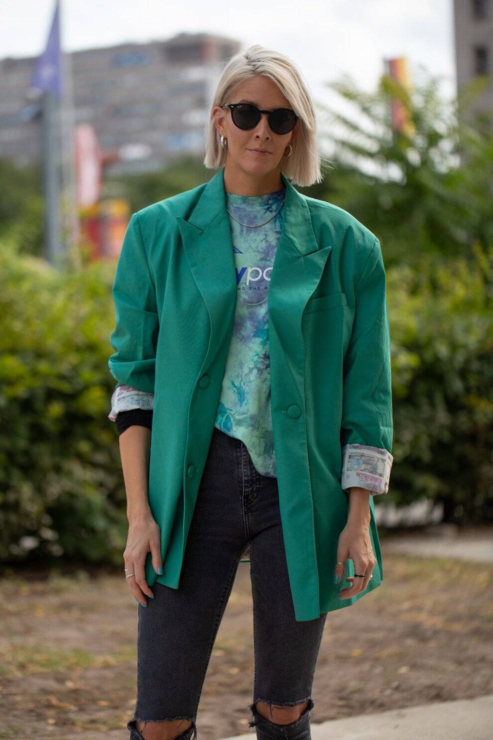 Пиджак справа сложнее стилизовать, чтобы образ выглядел современно