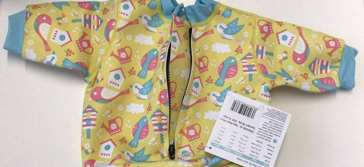 На грудничка в бассейне проще всего надеть гидрокостюм по принципу бодика. Он называется обертыш. Предохраняет от переохлаждения тело ребенка, оставляя открытыми руки и ноги. Раскрывается целиком, поэтому удобно одевать даже на непоседливого ребенка.