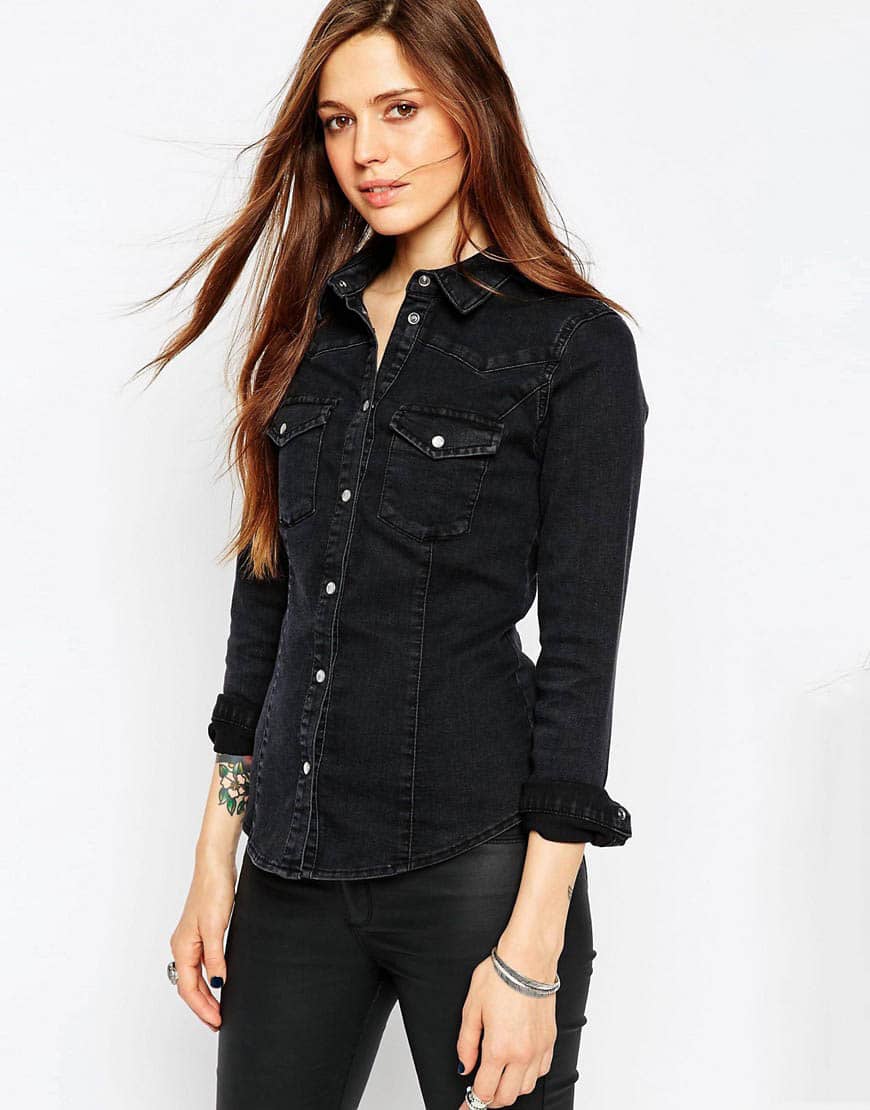 Носите черные джинсы с джинсовой рубашкой для классического образа