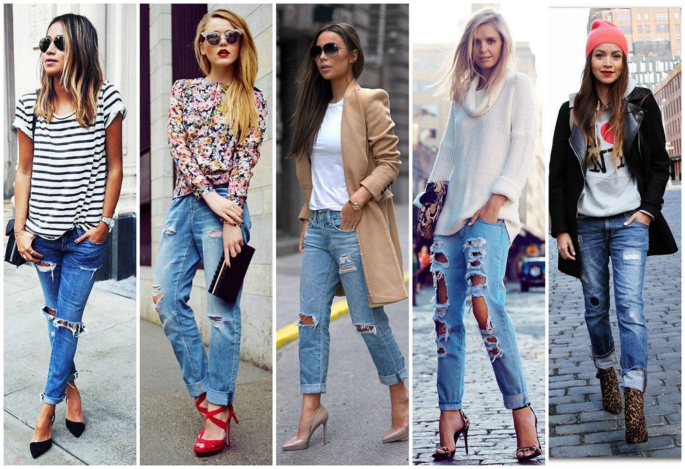 Потёртые бойфренды. Пользуются популярностью среди молодых девушек. Современные модели исключают огромные дыры, сейчас модными считаются фасоны с аккуратными прорезами, потёртостями в разных частях брюк: на карманах, коленках, ягодицах. Главное — чувство меры. Огромные дыры, порезы и потёртости в больших количествах на одной паре уже неактуальный вариант.