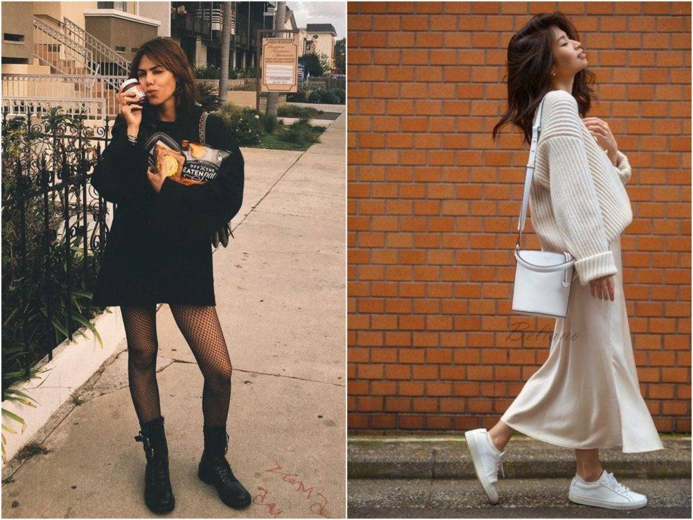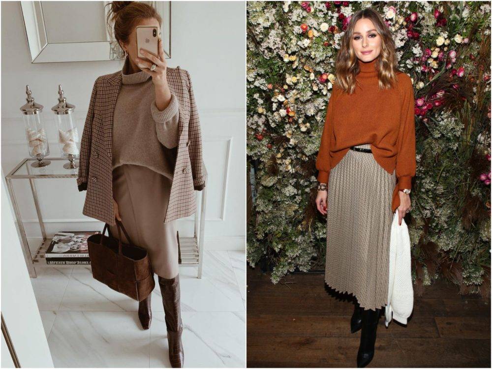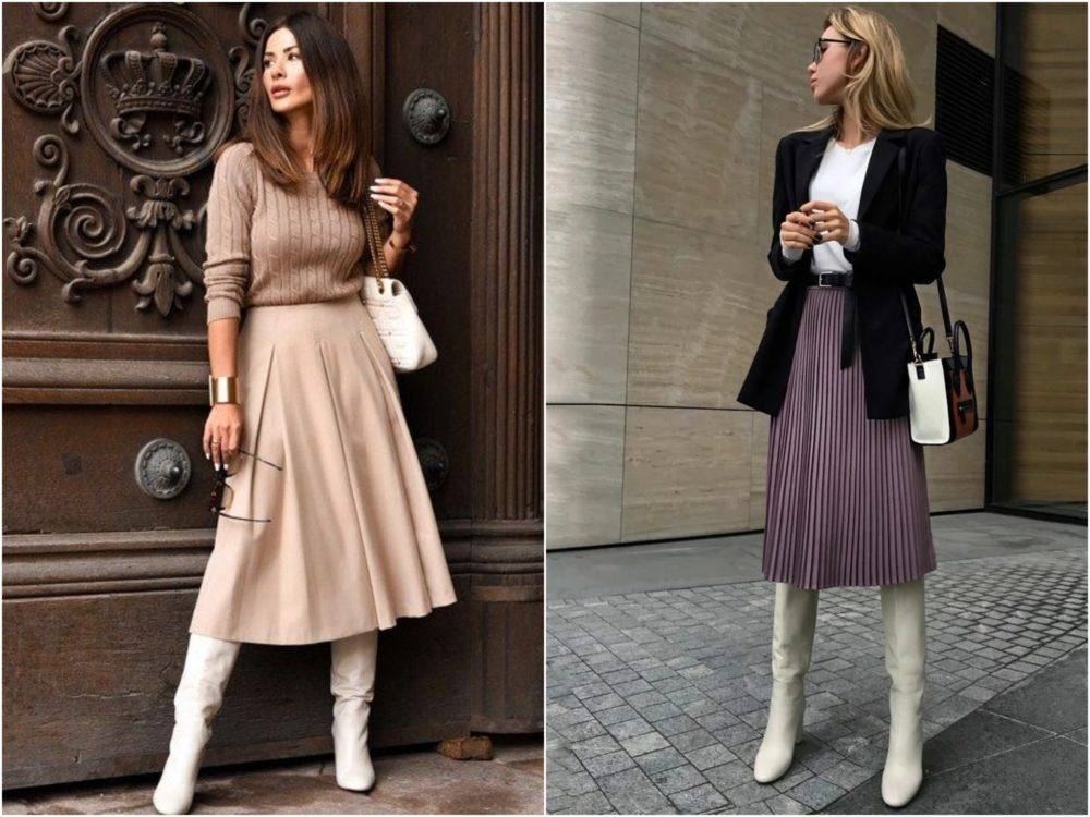 А вот сочетание юбки миди и высоких сапог, которые уходят прямо под юбку — очень удачное.