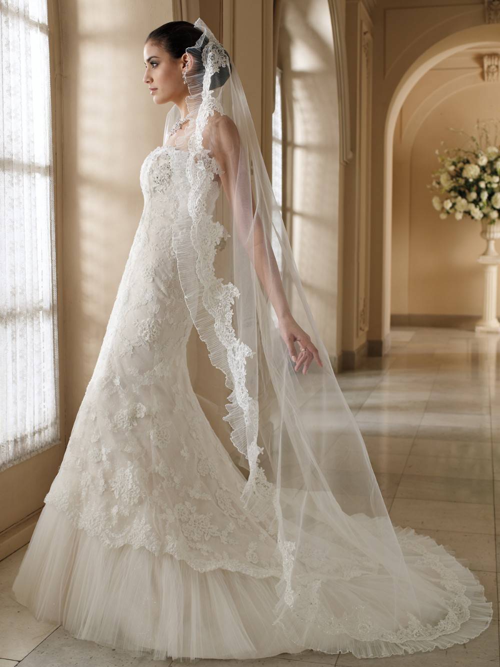 Этот испанский аксессуар имеет интересный способ крепления. Эта модель выглядит как кружевной платок покрывающий голову и плечи невесты, а крепится он невидимками, за счет чего создается впечатление, что крепления и вовсе отсутствуют.