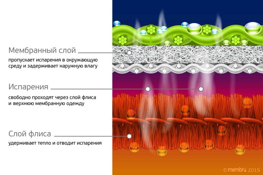 Слой флиса легко пропускает сквозь себя испарения от тела человека и остается при этом сухим, если дальнейшему испарению влаги не препятствует верхний слой одежды.