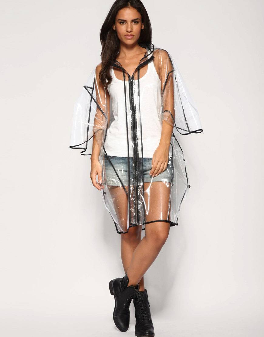 Прозрачный дождевик отлично сочетается как с классической одеждой — белой блузкой и юбкой-карандаш, так и с дерзкими рваными джинсами, джинсовыми шортами и летними комбинезонами.