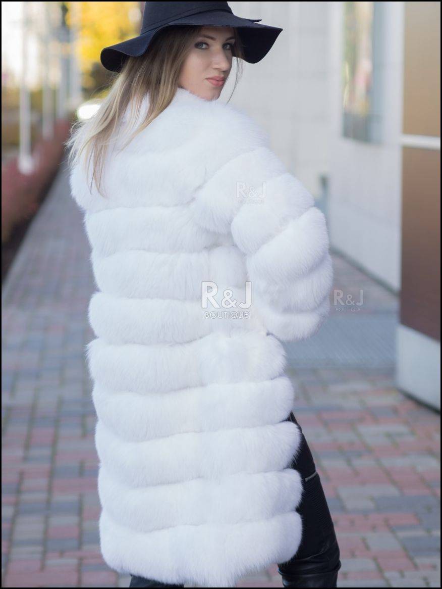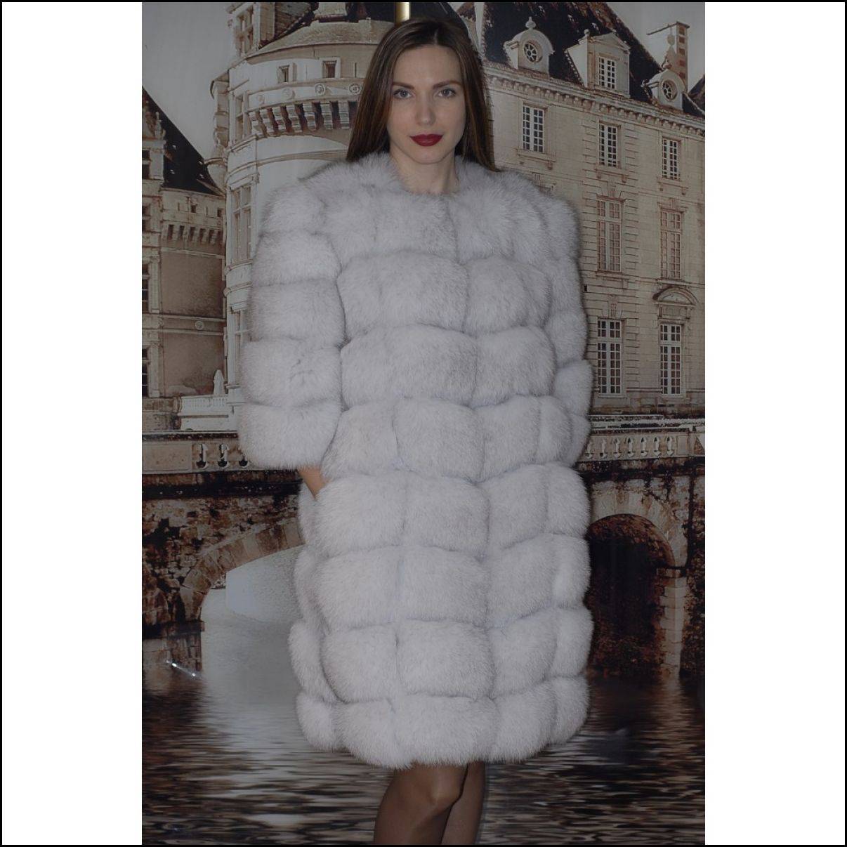 Вся красота песцового меха раскрывается у изделий, пошитых в вертикальную полоску. У такой шубки шкурки песца раскладываются продольно. Подобная раскладка меха уменьшает объемность мехового изделия.