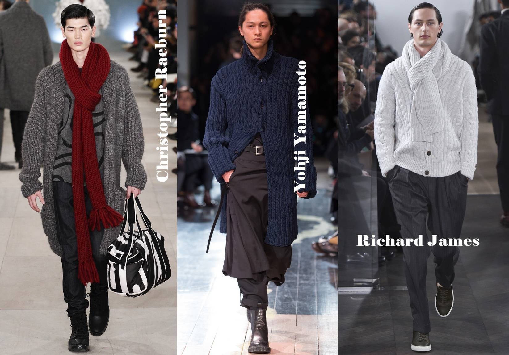 Мужское вязаное пальто часто носят с кашне или шарфом. Изделие может быть из мягкой пряжи или тонкого атласа. Оттенок шарфа подбирают таким образом, чтобы он сочетался с остальными элементами гардероба. В моде связанные аксессуары из неплотного трикотажа и с объемными узорами.