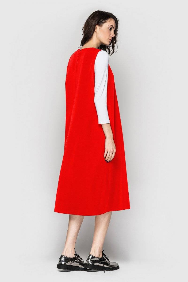 Универсальный вариант изделия, который подойдет каждому типу фигуры и удачно дополнится любым классическим верхом, представляет собой модель длиной чуть ниже колена из плотной фактурной ткани: крепа, шерсти, плотного трикотажа или хлопка, с острым удлиненным вырезом и широкими лямочками.