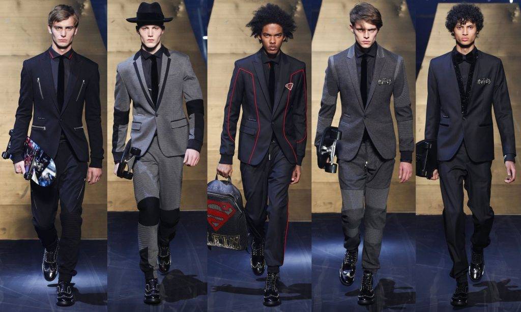 А здесь нас ожидает креативный демарш для многих законов этикета и модных правил. Незаурядность бренда позволила себе (кстати, уже не впервые) объединить однобортный пиджак и смокинг со спортивным стилем. Как бы это звучало непривычно, но показ получился вполне востребованным и позитивным. А обувь в стиле панк-рок с металлическими шипами не стала лишней в луках Philipp Plein. Некоторые мужчины сразу же отметят: «Ну, куда в таком виде можно пойти?» Помните, коллекция создаётся не всегда для полного подражания – это толчок, идея, мысль, подсказка как можно изменить устоявшийся стиль, в данном случае классический. А пиджаки у Philipp Plein очень даже крутые получились!