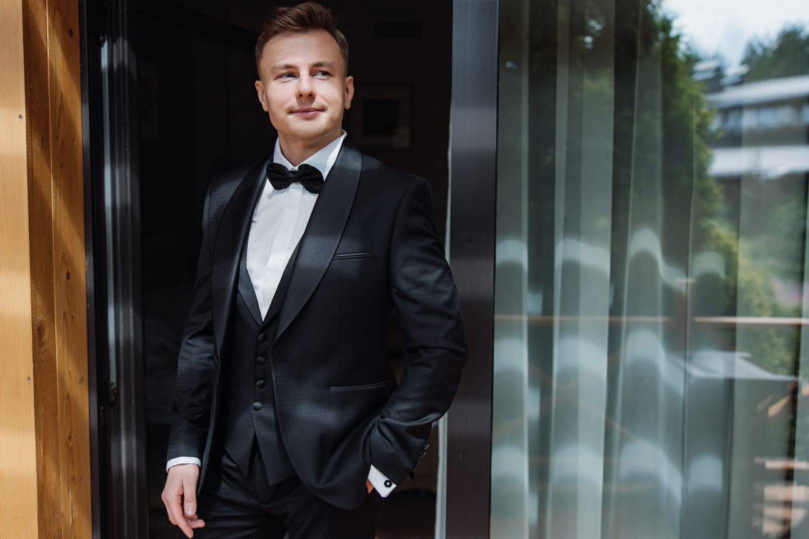 Не стоит слишком увлекаться модными тенденциями, особенно, если вы намерены носить костюм не один вечер, а использовать его и после свадьбы. Ширина лацканов, зауженные фасоны или оверсайз — все это меняется довольно часто, так что лучше выбирать костюм, который нравится и подходит лично вам, а не будет выглядеть устаревшим уже в следующем сезоне!