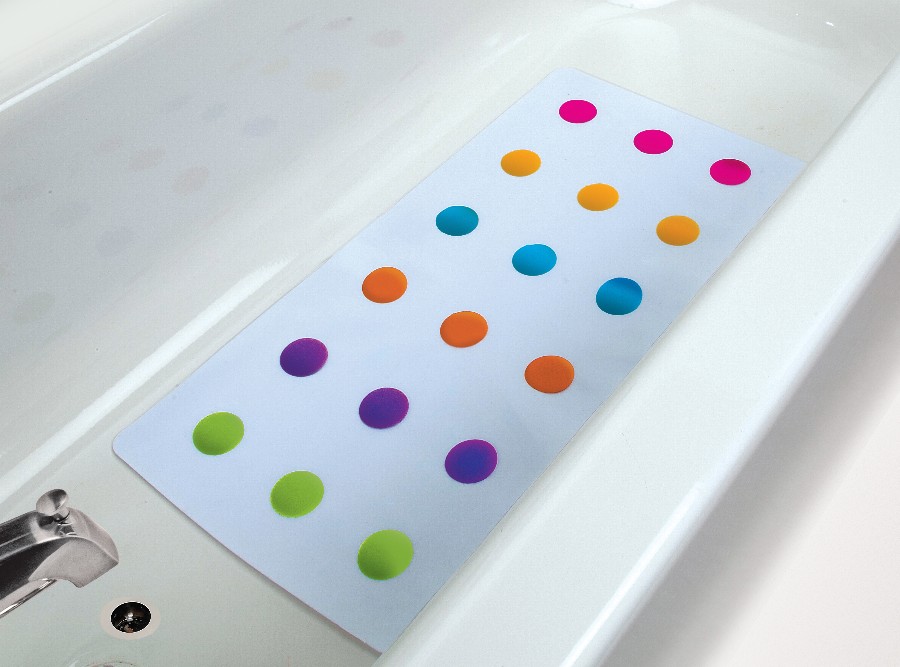 - Защита от скольжения во время принятия душа или ванны. Такие изделия должны обладать выраженными противоскользящими свойствами: их укладывают на дно душевого поддона или ванны. В качестве материала применяются силикон или резина, для уменьшения скольжения коврики снабжаются специальными присосками. Эти простые приспособления удобны, так как снижают риск скольжения, особенно если пользователями являются пожилые люди или дети-непоседы.