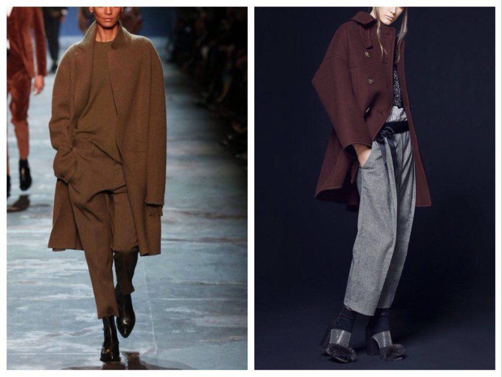 оверсайз. Женская одежда свободного кроя в тренде уже не первый сезон, и это легко объяснить: такие изделия не сковывают движений, скрывают лишние килограммы, создают стильный образ в стиле нормкор, кэжуал. Комбинация объемного свободного изделия и кожаных рукавов делает пальто более женственным, игривым;