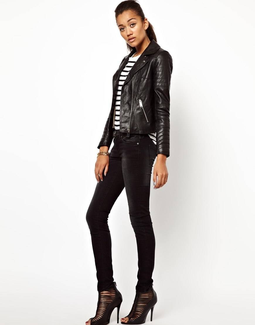 - Укороченная кожаная куртка. С помощью данной модели можно сделать акцент на вашей фигуре и визуально ее вытянуть.