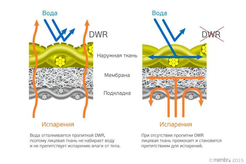 Без защиты DWR дышащие способности трехслойного мембранного материала под дождем снижаются — на внутреннем слое куртки оседает конденсат испарений от тела, могут появиться неприятные ощущения липкости.