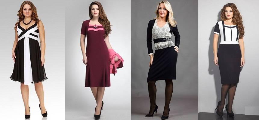Хорошо сидит платье по фигуре сложного кроя с небольшой горловиной, в форме баллона, с чуть завышенной талией, также А-силуэта. Модели, выкроенные по косой, уводят взгляд от тяжелой зоны, делая очертания фигуру более компактной. Удачным решением является белое платье с контрастным широким ремнем-корсетом.