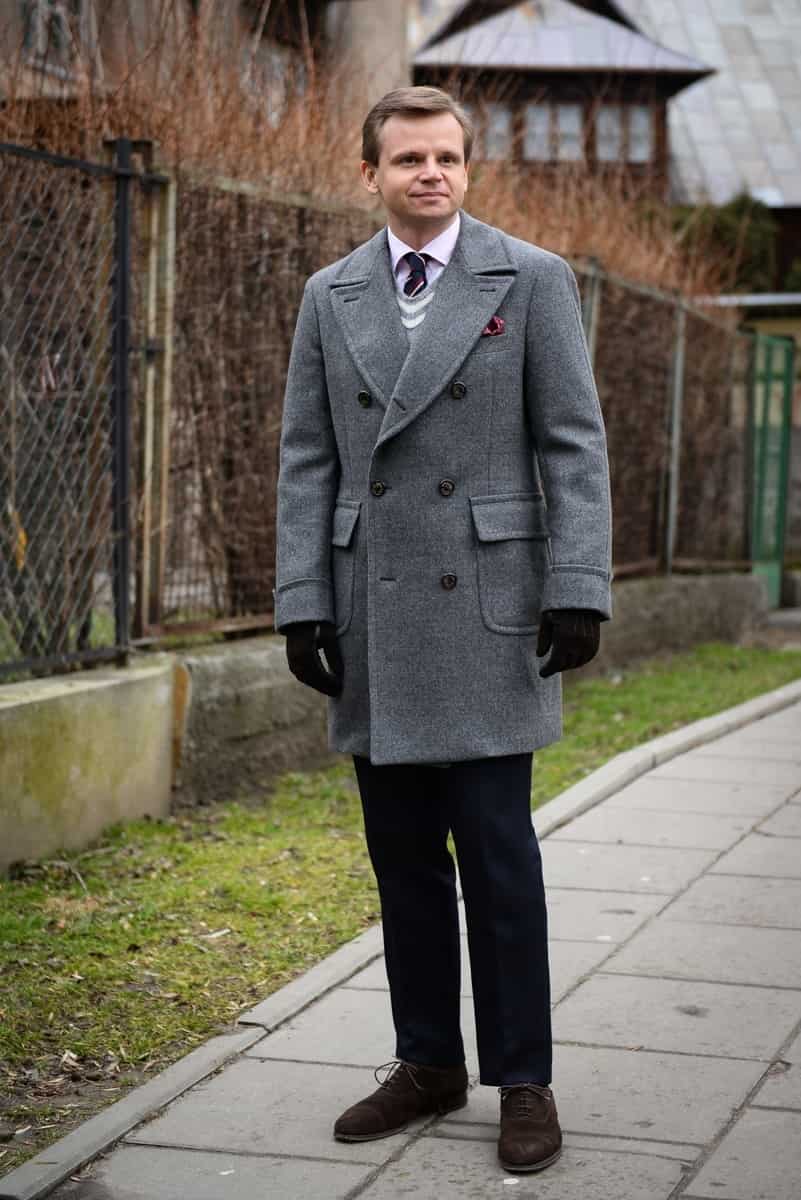 Классическое пальто. Это короткая двубортная модель с заостренными лацканами. Оно может быть как с поясом, так и прямое без пояса. Отлично подходит всем без исключения мужчинам, особенно для деловых бизнес-встреч.