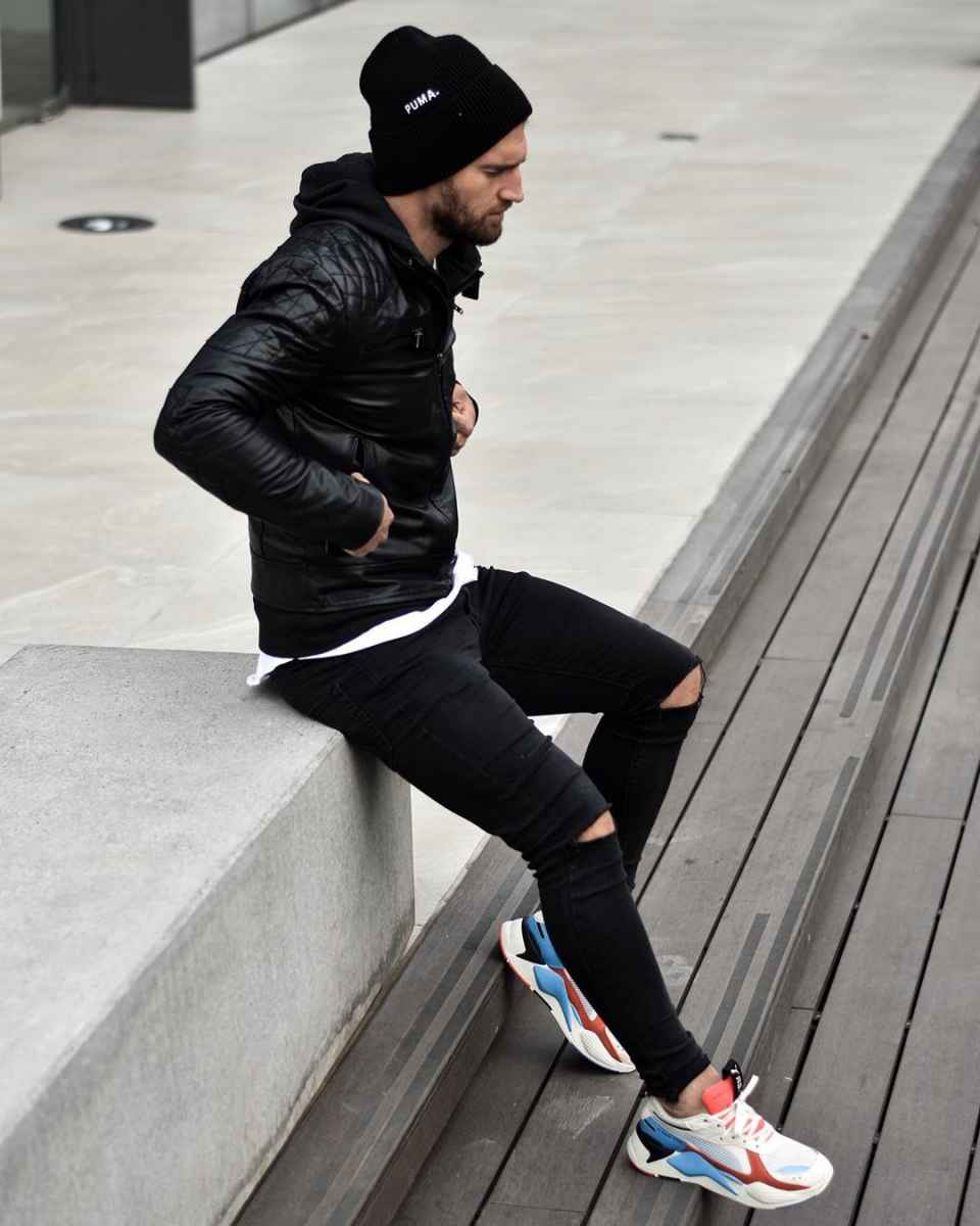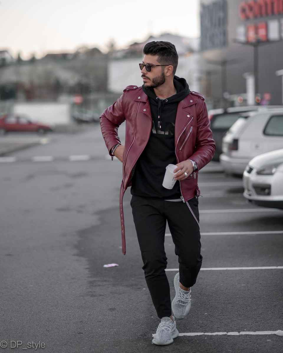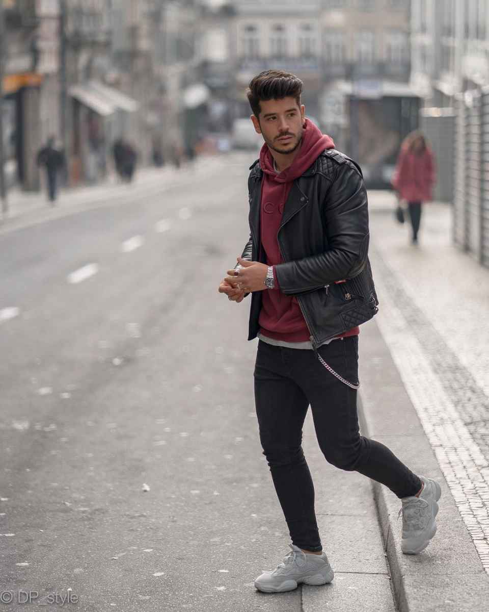 Кожанка с трикотажными манжетами сочетается с любым неофициальным низом. Также можно надеть любые джинсы, которые идеально сочетаются с толстовкой и капюшоном. Этот образ отлично завершат кроссовки в стиле new balance.