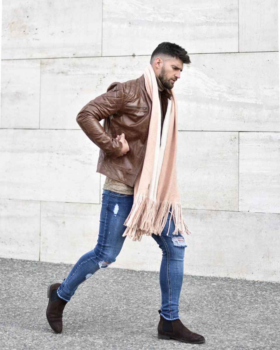 Темно-коричневая кожаная куртка здорово смотрится с джинсами, а более светлые оттенки коричневого с намеком на рыжий добавят винтаж к внешнему виду мужчины.